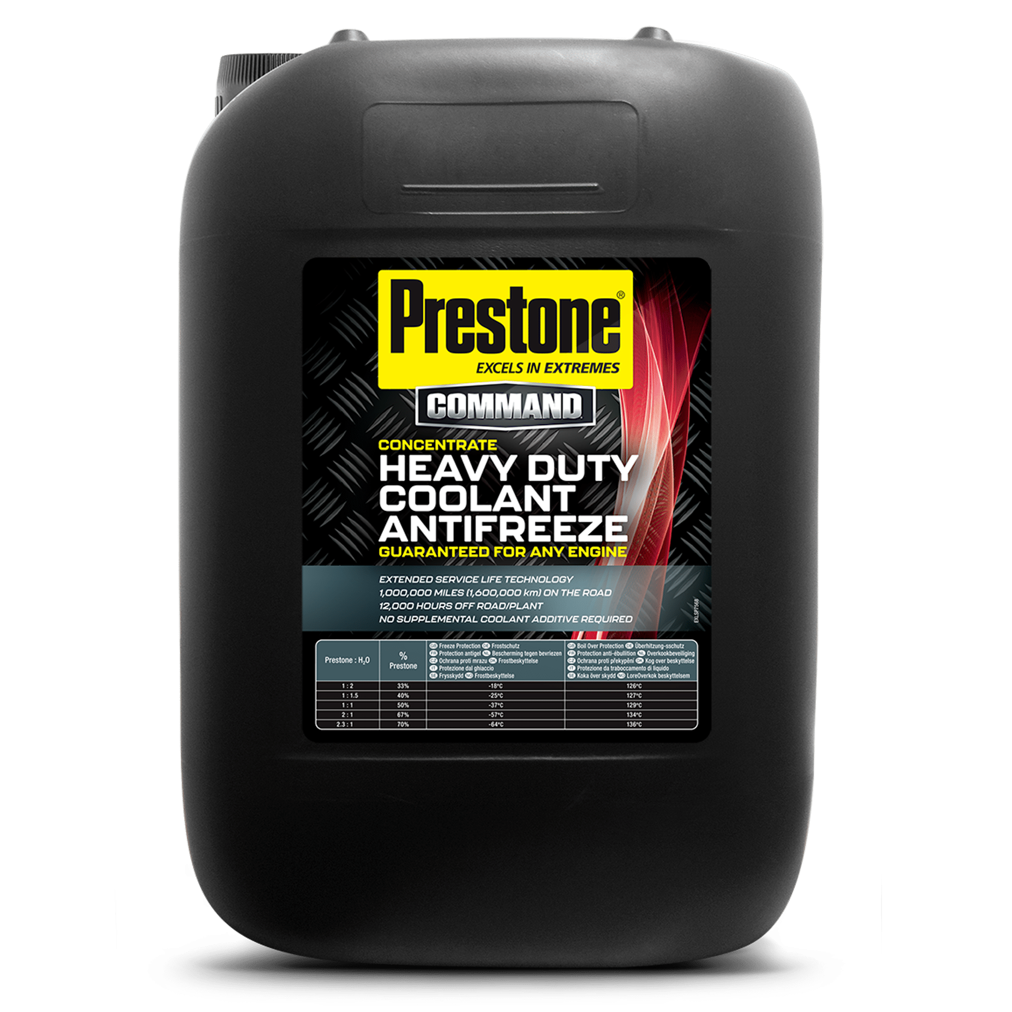 Prestone Command Hochleistungs-Kühl-/Frostschutzmittel bietet vollständigen Schutz für schwere Nutzfahrzeuge.